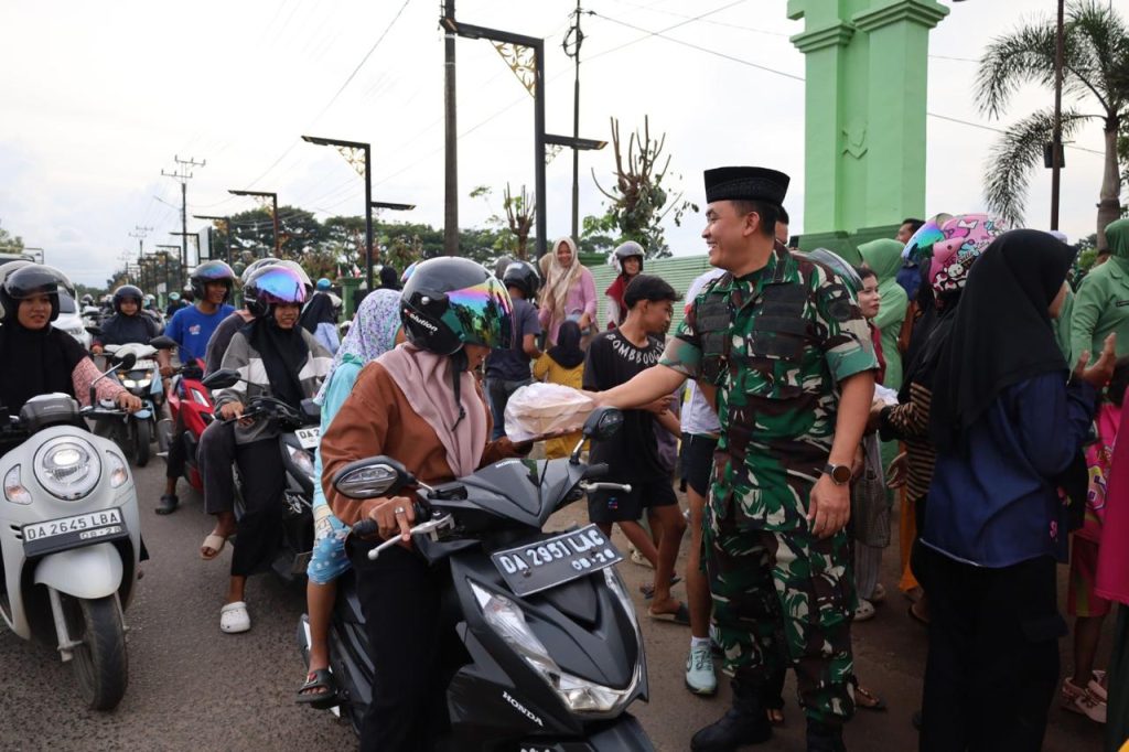 Tanah Laut – Dalam rangka menyemarakkan bulan suci Ramadhan 1447 H serta berbagi kebahagiaan dengan masyarakat, Komandan Distrik Militer (Dandim) 1009/Tanah Laut Letkol Inf Adhy Irawan, S.I.P., M.H.I., bersama Ketua Persit Kartika Chandra Kirana (KCK) Cabang XXXII Kodim 1009/Tanah Laut Ny. Dina Adhy Irawan turun langsung berbagi takjil kepada para pengguna jalan, Senin (09/03/2026).