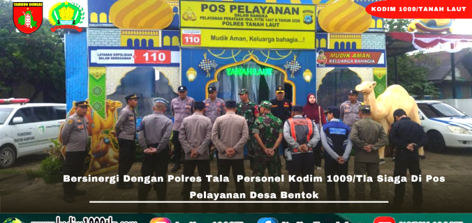Tanah Laut – Memasuki hari ketiga setelah perayaan Idul Fitri 1447 H, kegiatan pengamanan di Pos Pelayanan Bentok, Kecamatan Bati-Bati, Kabupaten Tanah Laut masih terus berlanjut. Hingga saat ini, Selasa (24/03/2026), personel Kodim 1009/Tanah Laut tetap bersiaga di lokasi sebagai bentuk komitmen dalam menjaga stabilitas keamanan dan ketertiban masyarakat.