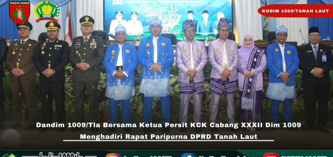 Pelaihari – Komandan Distrik Militer (Dandim) 1009/Tanah Laut Letkol Inf Adhy Irawan, S.I.P., M.H.I., didampingi Ketua Persit KCK Cabang XXXII Dim 1009 Koorcab Rem 101 PD XXII/Tambun Bungai Ny. Dina Adhy Irawan menghadiri Rapat Paripurna DPRD Kabupaten Tanah Laut dalam rangka memperingati Hari Jadi ke-60 Kabupaten Tanah Laut Tahun 2025, Selasa (02/12/2025).