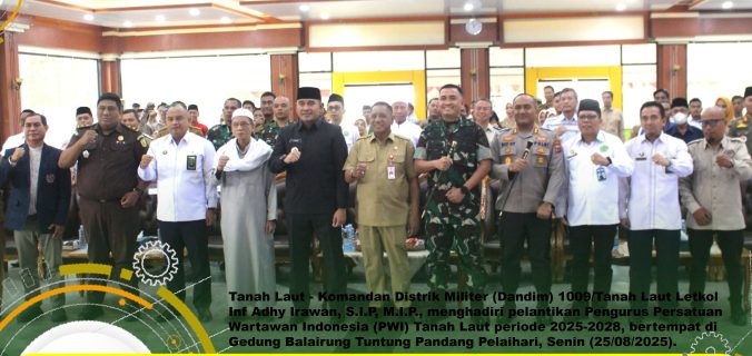 Tanah Laut – Komandan Distrik Militer (Dandim) 1009/Tanah Laut Letkol Inf Adhy Irawan, S.I.P, M.I.P., menghadiri pelantikan Pengurus Persatuan Wartawan Indonesia (PWI) Tanah Laut periode 2025-2028, bertempat di Gedung Balairung Tuntung Pandang Pelaihari, Senin (25/08/2025).