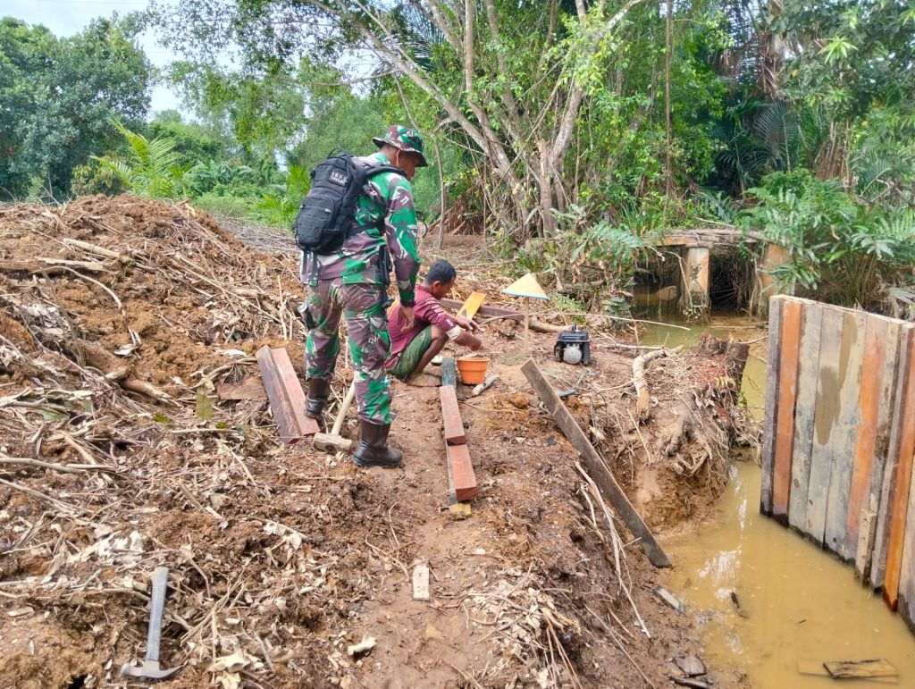 Tanah Laut – Babinsa Koramil 1009-01/Jorong Kodim 1009/Tanah Laut terus menunjukkan kepeduliannya terhadap sektor pertanian di wilayah binaannya. Hal itu terlihat saat Sertu Abdullah hadir langsung mengawasi pembangunan pintu air irigasi sederhana yang sedang dikerjakan warga di Desa Asam-Asam, Kecamatan Jorong, Kabupaten Tanah Laut, Senin (22/09/2025).