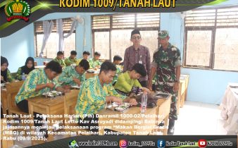 Pelaksana Harian (Plh) Danramil 1000-02/Pelaihari Kodim 1009/Tanah Laut Lettu Kav Asruyadi didampingi Babinsa jajarannya meninjau pelaksanaan program “Makan Bergizi Gratis (MBG) di wilayah Kecamatan Pelaihari, Kabupaten Tanah Laut, Rabu (09/9/2025).