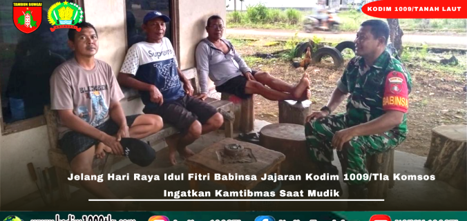 Tanah Laut – Menjelang perayaan Hari Raya Idul Fitri 1447 H, Babinsa jajaran Kodim 1009/Tanah Laut semakin mengintensifkan kegiatan komunikasi sosial (Komsos) di wilayah binaan masing-masing, Kamis (19/03/2026). Kegiatan ini dilakukan sebagai langkah preventif guna mengingatkan dan meningkatkan kewaspadaan masyarakat yang akan meninggalkan rumah untuk melaksanakan mudik ke kampung halaman.