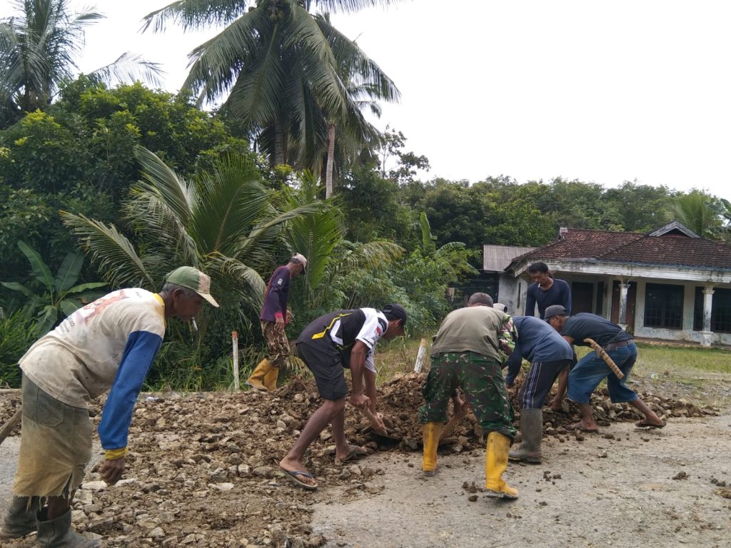 Tanah Laut – Melihat kondisi jalan desa yang berlubang dan berpotensi membahayakan pengguna jalan, Sertu Tulus Baskoro Babinsa Posramil Batu Ampar bersama warga setempat melaksanakan penimbunan jalan, bertempat di Desa Gunung Melati, Kecamatan Batu Ampar, Kabupaten Tanah Laut, Minggu (08/02/2026).