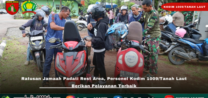Personel Kodim 1009/Tanah Laut yang dibantu oleh Persit KCK Cabang XXXII Dim 1009 tampak siaga memberikan pelayanan dan pengamanan, mulai dari pengaturan lalu lintas di sekitar rest area, membantu kelancaran parkir, hingga memastikan kenyamanan dan keselamatan jamaah.