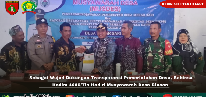 Tanah Laut – Salah satu bentuk dukungan dalam menjaga transparansi serta akuntabilitas penyelenggaraan pemerintahan, Babinsa Koramil 1009-06/Kintap, Kodim 1009/Tanah Laut Kopka Gatot Suharyanto, menghadiri Musyawarah Desa (Musdes) Pertanggungjawaban Pemerintah Desa Mekar Sari, Kecamatan Kintap, Kabupaten Tanah Laut, yang digelar di balai desa setempat, Jum’at (27/03/2026).