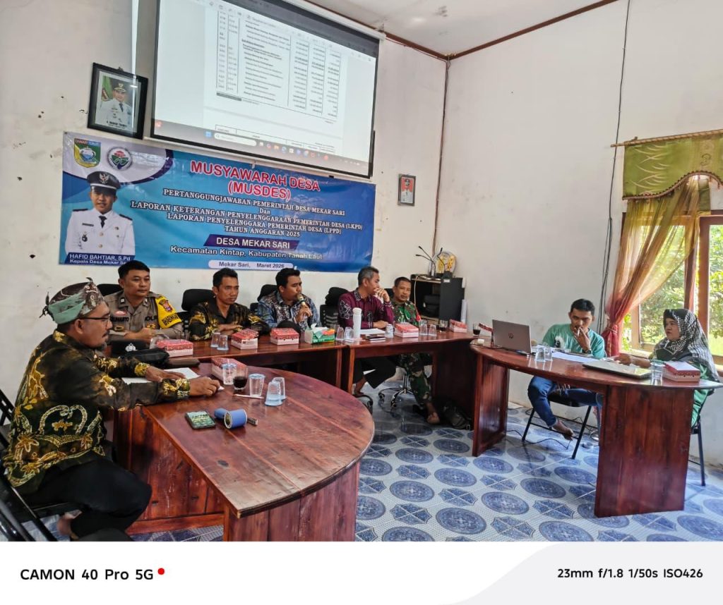 Kegiatan Musdes tersebut membahas Laporan Keterangan Penyelenggaraan Pemerintahan Desa (LKPPD) serta Laporan Keterangan Pertanggungjawaban Desa (LPPD) Tahun Anggaran 2025. Turut hadir dalam kegiatan tersebut Kepala Desa Mekar Sari beserta perangkat desa, Pemdamping Desa, BPD, tokoh masyarakat, tokoh agama serta unsur terkait lainnya.