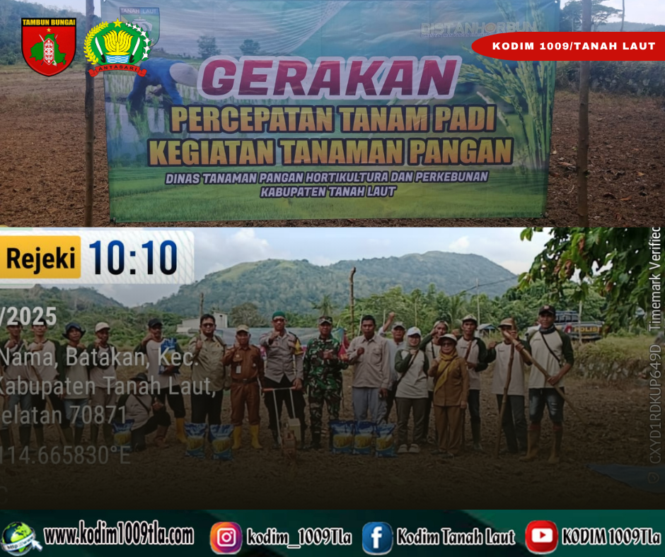 Tanah Laut – Suasana penuh semangat tampak di areal persawahan Desa Batakan, Kecamatan Panyipatan, Kabupaten Tanah Laut, saat Babinsa Pos Koramil Panyipatan bergotong royong bersama para petani dalam kegiatan Gerakan Percepatan Tanam Padi, Senin (13/10/2025). Di bawah terik matahari, tidak menyurutkan semangat mereka dalam upaya mendukung program ketahanan pangan nasional.