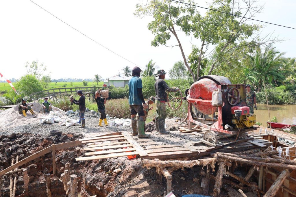 Tanah Laut – Langkah pasti terus ditunjukkan dalam pembangunan Jembatan Perintis Garuda di Desa Handil Labuan Amas, Kecamatan Bumi Makmur. Setelah melalui proses panjang dan penuh tantangan, personel Kodim 1009/Tanah Laut akhirnya menuntaskan pengerjaan landasan menara pilon tepi dekat yang merupakan bagian vital yang akan menjadi tumpuan utama berdirinya konstruksi jembatan, Minggu (26/04/2026).