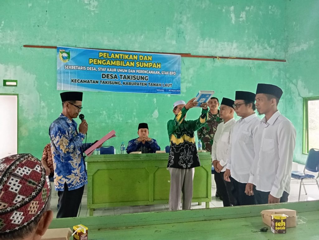 Kegiatan pelantikan yang berlangsung dengan khidmat tersebut dilaksanakan di gedung serbaguna desa Takisung, Kecamatan Takisung, Kabupaten Tanah Laut, Kamis (26/03/2026), dan dihadiri oleh unsur pemerintah kecamatan, kepala desa, tokoh masyarakat, serta tamu undangan lainnya. Prosesi pelantikan berjalan lancar, diawali dengan pengambilan sumpah jabatan serta penandatanganan berita acara oleh perangkat desa yang baru dilantik.